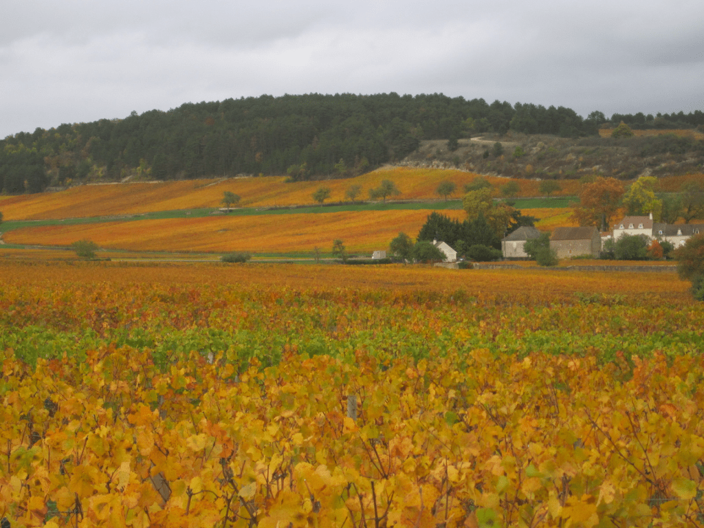 This is the perfect day for looking at the changing, autumnal colours of Burgundy vineyards in the Côte d’Or. Still touches of green or lime green here or there, but more intensely yellow, gold and old gold through to orange and occasional flashes of carmine.