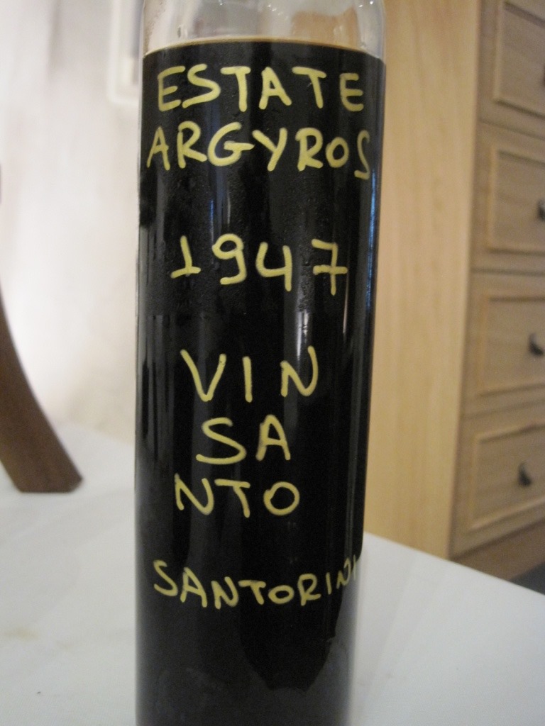 An unanticipated treasure during a tasting of Santorini wine styles. This was made at the time when much production for personal use consisted of vinsanto – a dried grape wine style. Grapes were picked and the bunches left out in the sun for maybe around 10 days, before being crushed and processed in the normal way. The drying concentrated sugar in the grapes at the expense of water, so when the yeast finally gave up the ghost there was still a lot of sweetness remaining in the wine. This is a way of making wine which we know has existed for at least 2,800 years – and probably much longer as a way of providing sweet wines. Long-term barrel ageing adds oxidative complexity. The most interesting wine I have tasted this year.